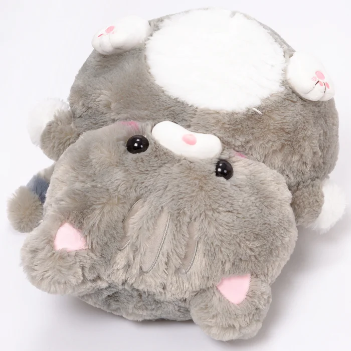 Each has little legs and a ginormous tummy so they’re not very good at sitting like a normal cat, but that just makes them cuter! And their big size (15”) makes them purr-fect for displaying on a couch or bed!