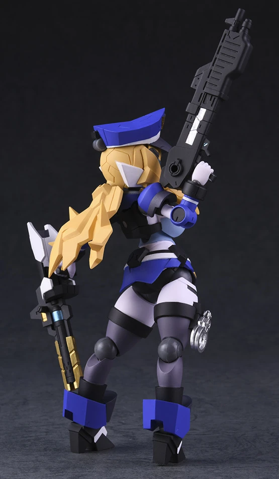 From Daibadi comes this highly articulated figure of Kelly from the visual novel Robot Neoanthropinae Polynian. She has a sleek look and curvy figure. Highlights include the vivid police blue paint of her outfit detailed with metallic gold, her long poseable ponytail, her two optional expressions, and the many included accessories of which one is handcuffs she can actually wear and break out off! Also comes with a police hat and two weapons. She measure 5.1” and stands on a cool transparent hex base.